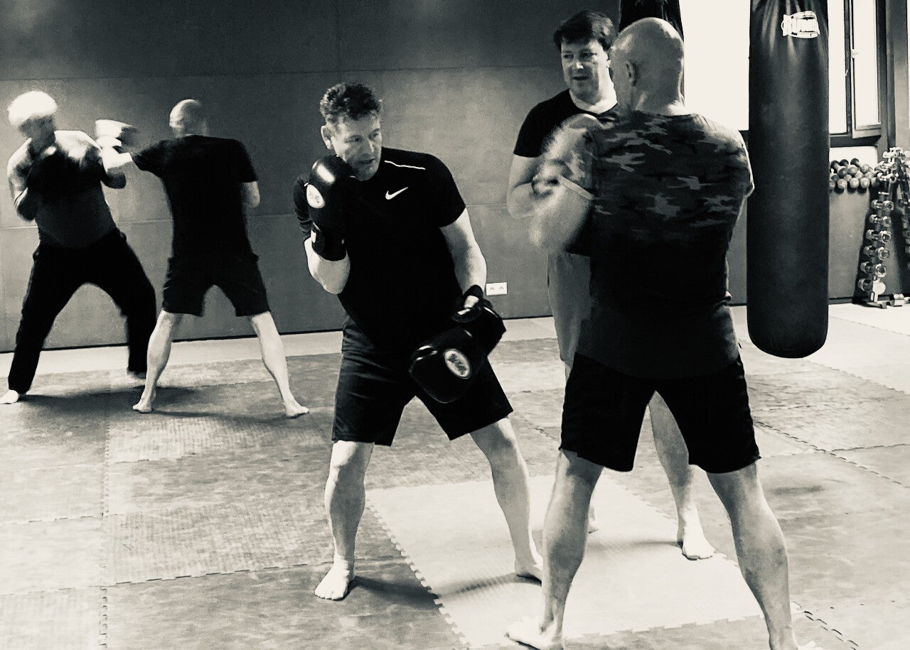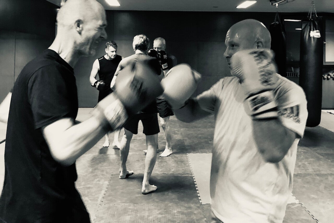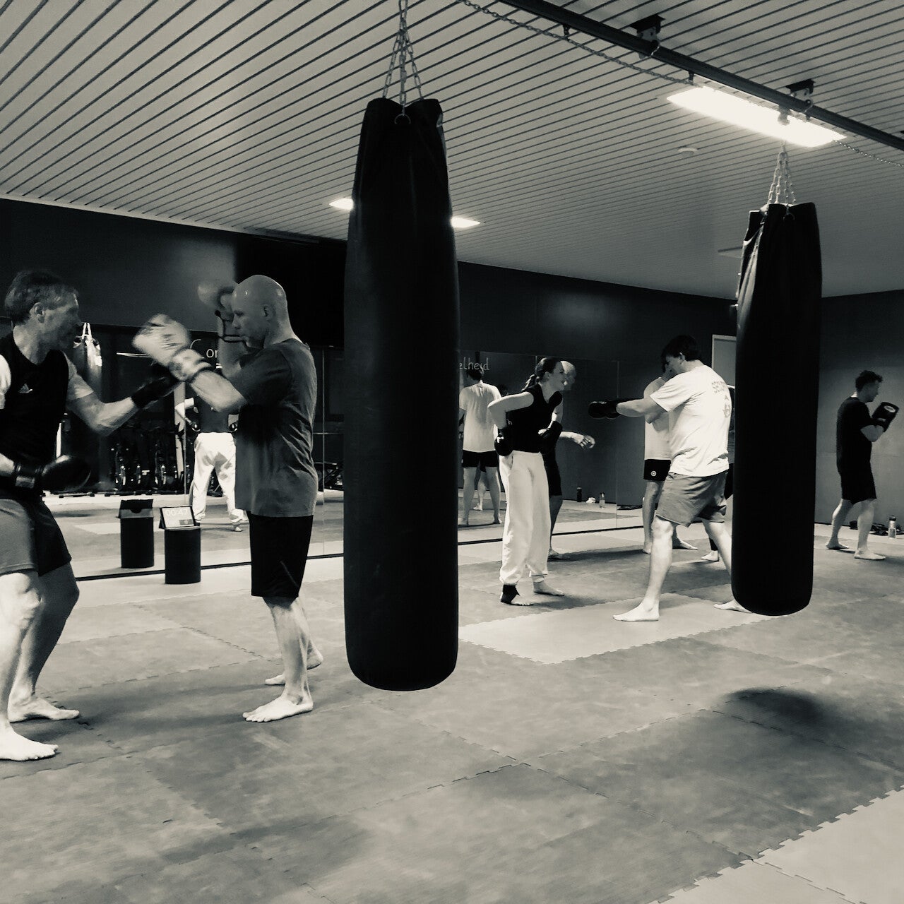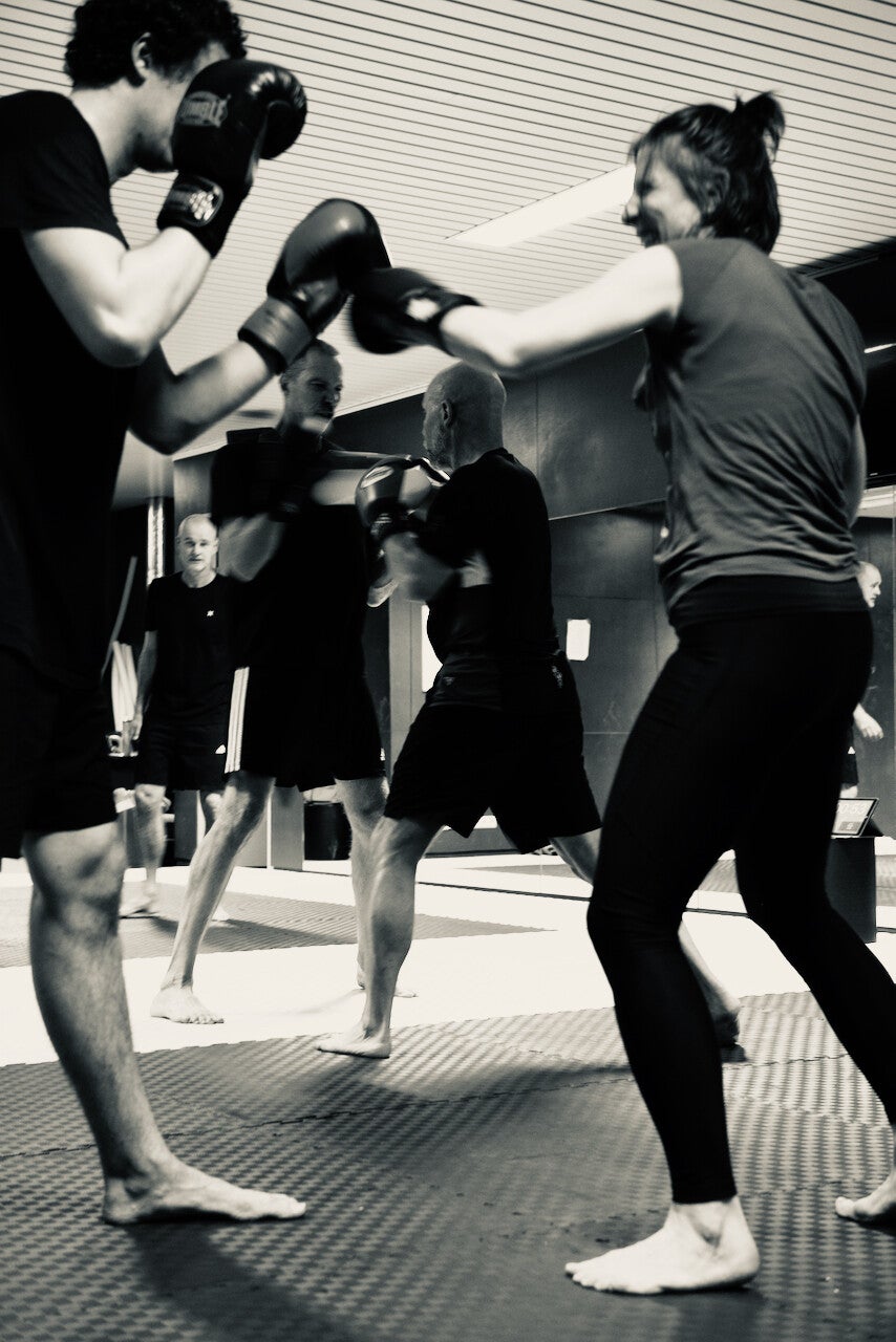 Bokshandschoenen aanwezig. We trainen in een dojo op blote voeten.