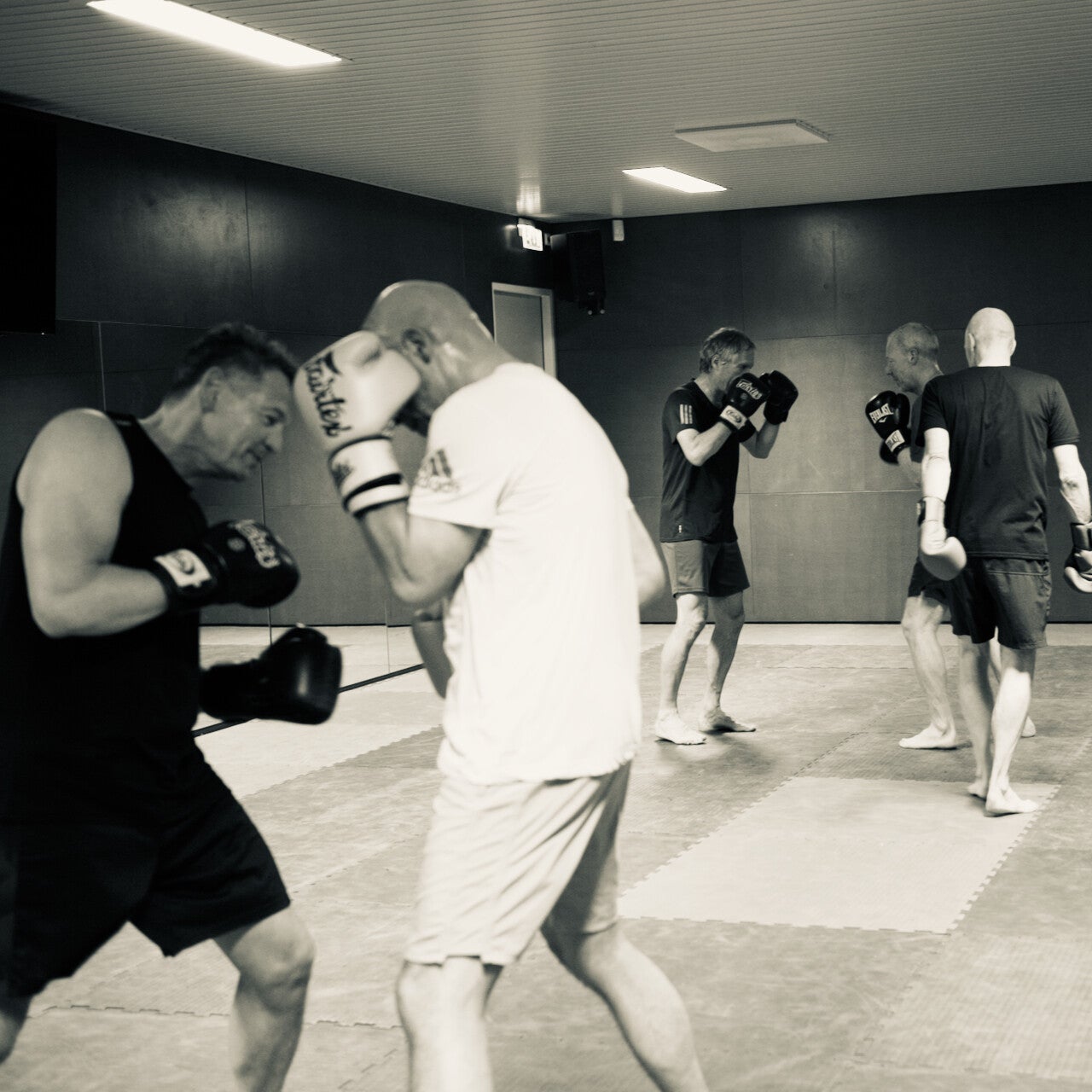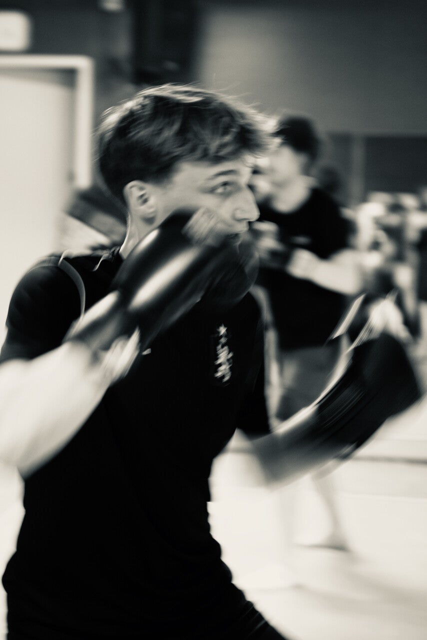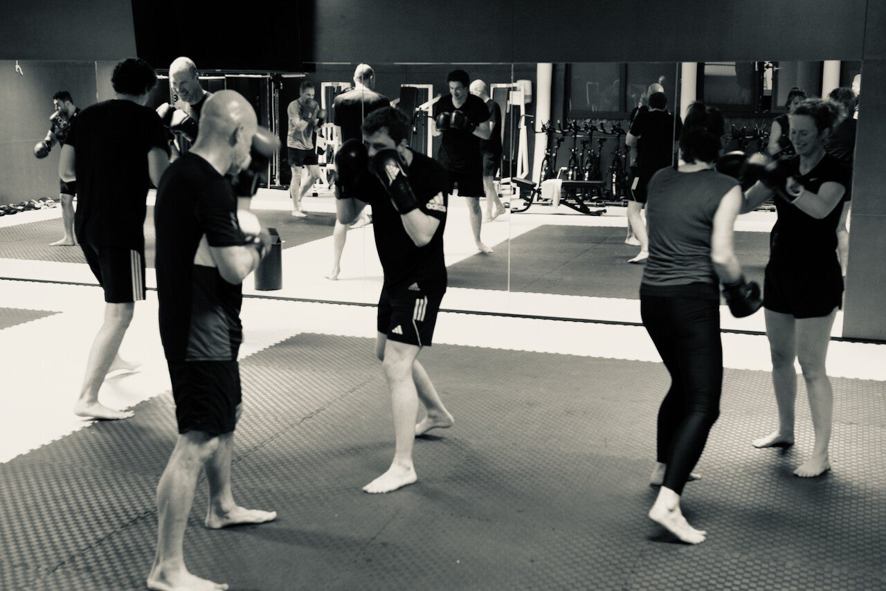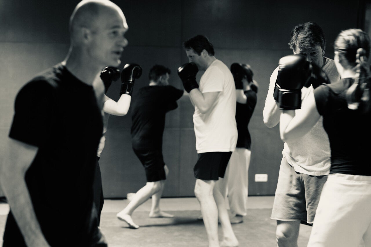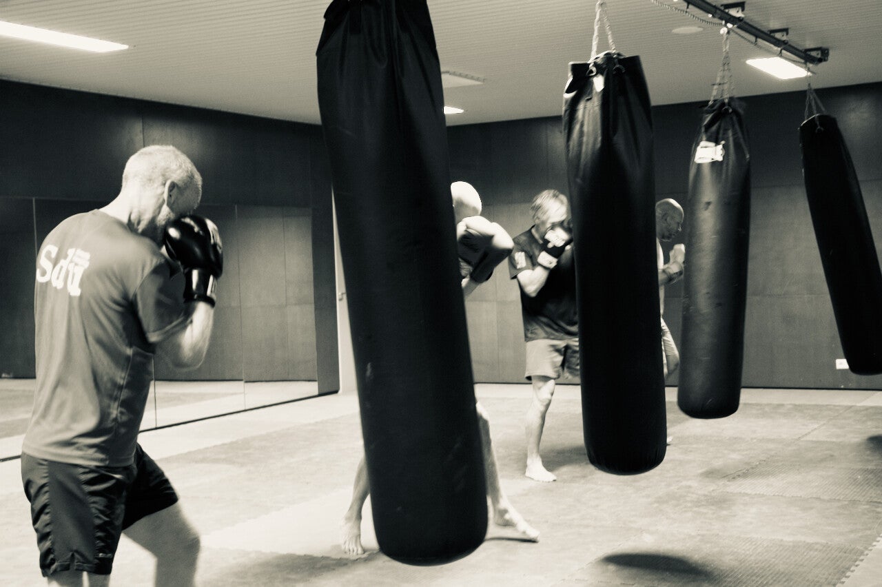 Bokshandschoenen aanwezig. We trainen in een dojo op blote voeten.