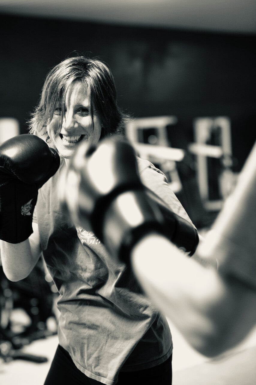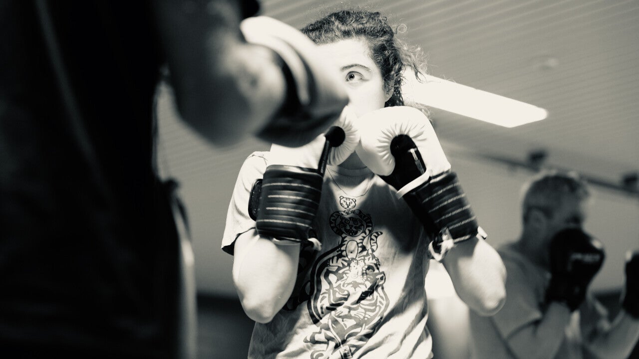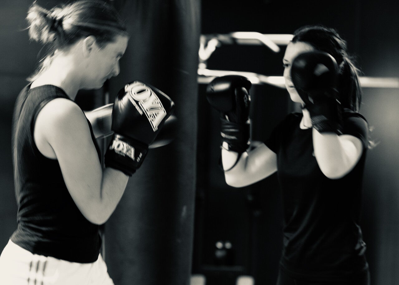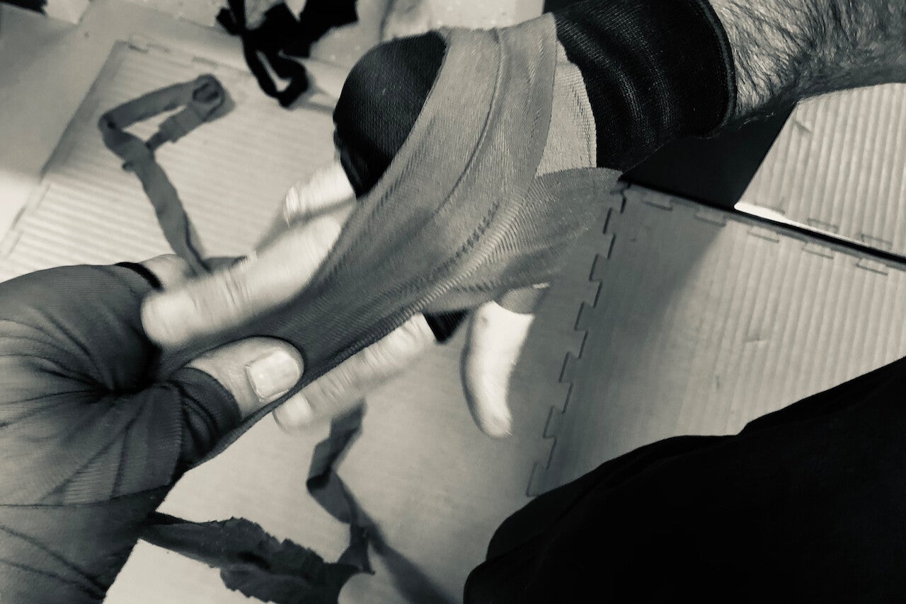 Bokshandschoenen aanwezig. We trainen in een dojo op blote voeten.